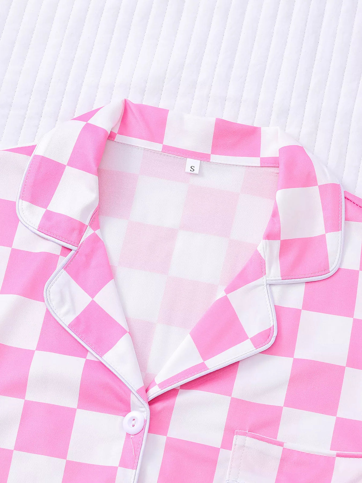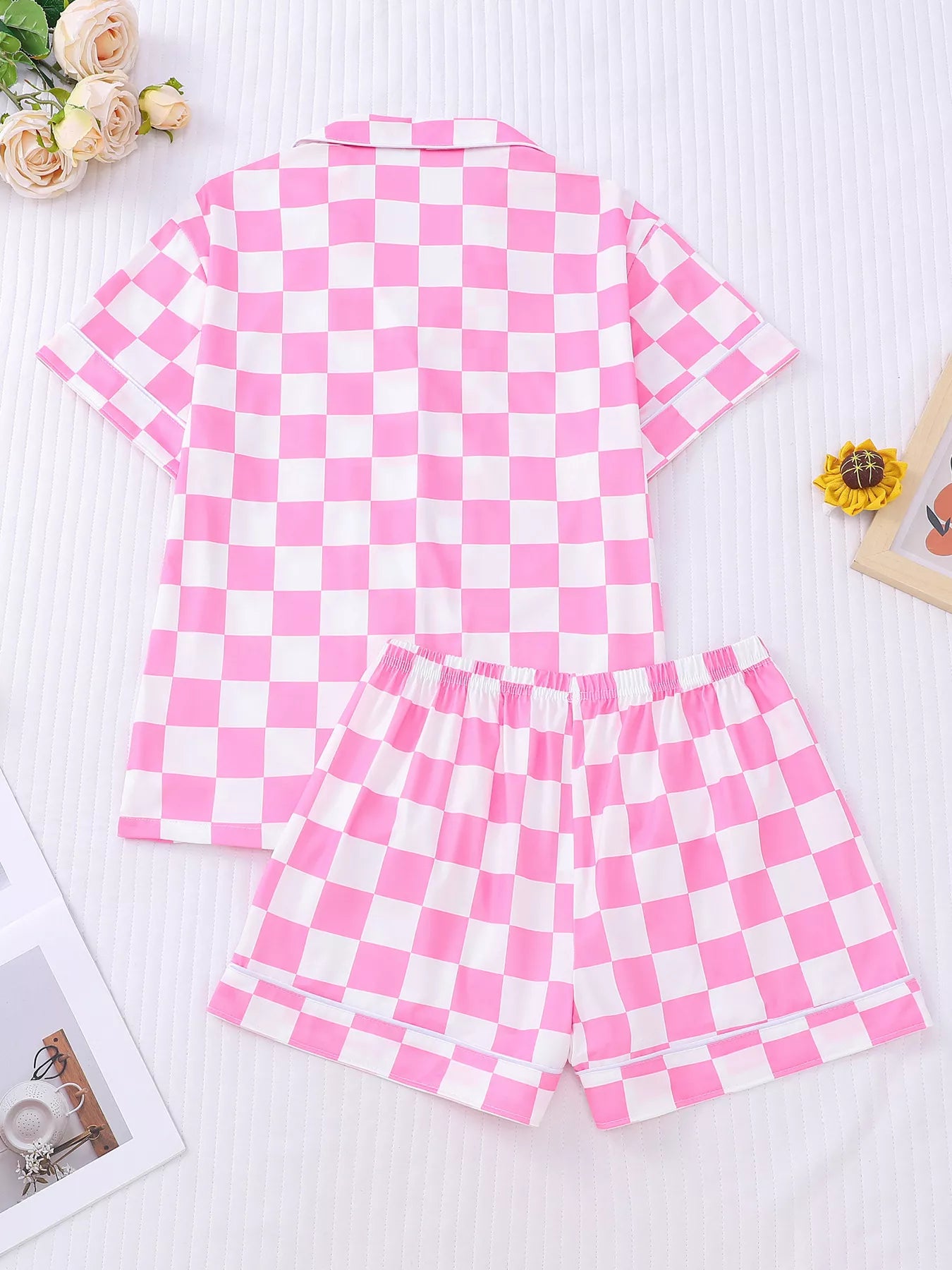 Checkered Print Button Up Top and Shorts Lounge Set - Pink / S